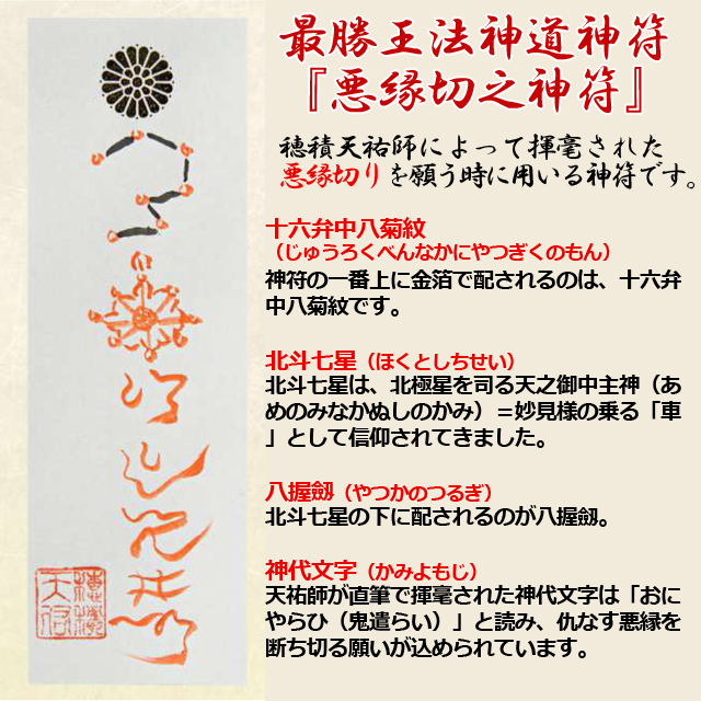 子之神社穂積天祐特別揮毫「最勝王法神道神符」(陰陽師 厄除け 財運 悪縁切り 所願成就 金運招来 厄除開運 所願成就 大護摩 御祈祷 護符 桐箱入り 神代文字 十六弁中八菊紋 北斗七星 蛇比禮 如意寶珠 八握劔)