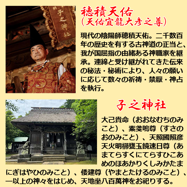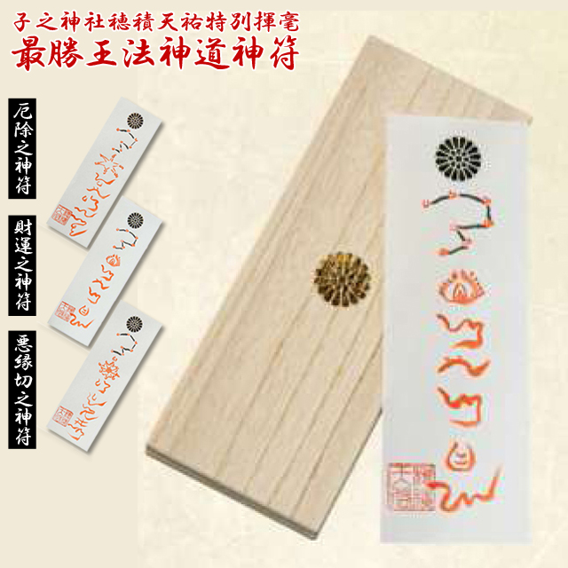 『最勝王法神道神符』は、大和建国の祖神・櫛甕玉饒速日尊の直系、また後醍醐天皇の王孫、南帝・小倉宮良泰親王(第100代招慶院天皇)の正統な皇胤であり、陰陽道の祖である役行者(えんのぎょうじゃ)より陰陽の秘法、安倍晴明の末裔の土御門家より天社陰陽道を授けられた穂積家の嫡流として、二つの陰陽道の法脈を受け継ぐ唯一の陰陽師である子之神社宮司穂積天祐(神道芳名:天佑宜龍大彦之尊)が神世文字で揮毫された神符でです。
