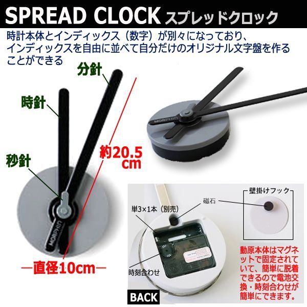 | 仕様 | ■サイズ:[動原本体]約直径10×厚4cm [長針]約20.5cm ■重さ:[動原本体]約86g [総計]約145g ■材質:アルミ ■電源:単3×1本(別売) ■ムーブメント:クォーツ式 ■セット内容:動原本体(時針/分針/秒針)、インデックス(1-12時/両面テープ付き)、 動原本体壁掛けフック(両面テープ・マグネット付き)、 インデックス配置用サポート(56cm完成サイズ) ■種類:【LUMINOUSルミナス】【MULTIマルチ】【WOODウッド】【TINティン】 |