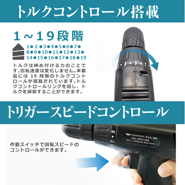 | 仕様 | ■サイズ:[電動ドリルドライバー]約幅220×高230×奥80mm(バッテリー含む) [収納ケース]約幅350×高350×奥100mm ■重量:[電動ドリルドライバー]約1.5kg(バッテリー含む) [全セット]約3.7kg ■材質:ABS樹脂、ポリエチレン 他 ■充電バッテリー:18Vニッケルカドミウム電池 ■充電時間:約3.5時間 ■使用可能時間:約30分 ■充電器:[入力]100-240V 50/60Hz 0.2A [出力]23V 0.4A ■回転数:0-550rpm(回転/分) ■トルクコントロール:19段階 ■チャック使用可能直径:約0.8-10mm ■仕様:18Vパワー、全92ピース、安全ロックスイッチ(正逆回転切替え)、 トリガースピードコントロール、専用キャリーケース |