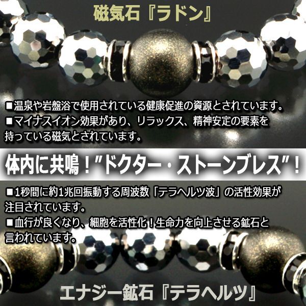 | 仕様 | ■サイズ:(フリー)伸縮式16-20cm ■重さ:約24g ■材質:テラヘルツ8mm×15、ラドン(フェライト磁石+ラドンパウダー コーティング)10mm×5、ロンデル(真鍮+ラインストーン/6×3mm)×10、 ポリウレタンゴム ■日本製 |
