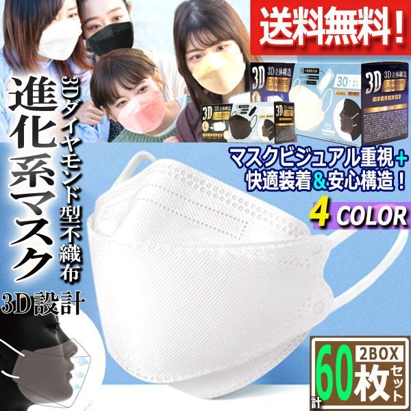 3Dダイヤモンド型不織布マスク4層99%カットフィルター2BOX(計60枚)セット