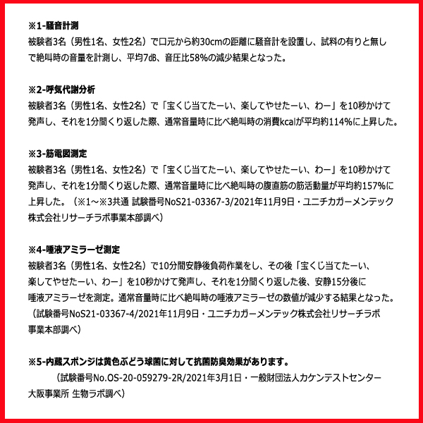 試料の有りと無しで絶叫時の音量を計測し、平均7dB、音圧比58%の減少結果