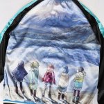 リバーシブル面(ブルー地)には、本栖湖から富士山を眺める5人のイラストを配置。