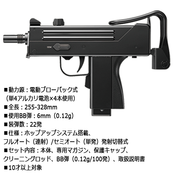 | 仕様 | ■動力源:電動ブローバック式(単4アルカリ電池×4本使用) ■全長:255-328mm ■使用BB弾:6mm(0.12g) ■装弾数:22発 ■仕様:ホップアップシステム搭載、フルオート(連射)/ セミオート(単発)発射切替式 ■セット内容:本体、専用マガジン、保護キャップ、クリーニングロッド、 BB弾(0.12g/100発)、取扱説明書 ■10才以上対象 |