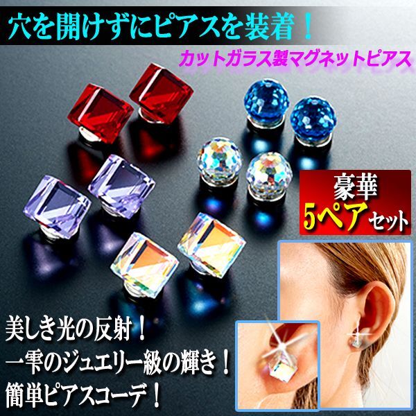ジュエリー級の美しき輝き!カットガラス製マグネットピアス豪華5ペアセット