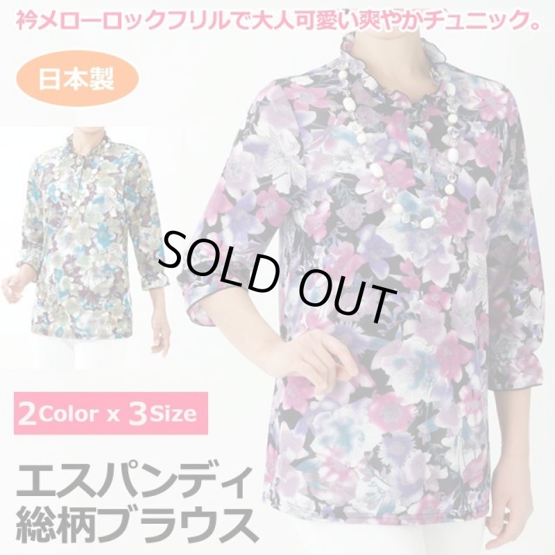 母の日 日本製 チュニック 花柄 七分袖 長袖 レディース 女性用 婦人用 着心地涼やか 春 夏 お洒落 衿元 袖口 メロウ仕立て ストレッチ性 ソフトな風合い 大人可愛い 贈り物 プレゼント 大人カジュアル オシャレ 洗い替え