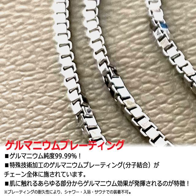| 仕様 | ■サイズ:約長55cm・幅1.5mm ■重量:約6g ■素材:合金(ロジウムメッキ加工) ■ゲルマニウムプレーティング:[ゲルマニウム純度]99.99% ※プレーティングの耐久性により、シャワー・入浴・サウナでの装着不可。 |