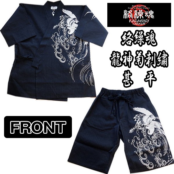 絡繰魂龍神菊刺繍甚平 (カラクリタマシイ,綿100%,しじら織,男性用,メンズ部屋着,夏,お祭りカジュアルウェア,刺繍,抜染プリント) [CRT-272531]