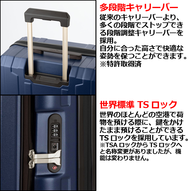 | 仕様 | ●本体色:4色 ●本体サイズ:69×47×30(+7)cm ●全体サイズ:76×51×30(+7)cm ●重量:5.1kg ●容量:88(108)L ●本体素材:ポリカーボネート+ABS樹脂 ●宿泊目安:8泊〜10泊 ●ロック:TSA対応ダイヤルロック ●キャスター:クッション付き静音ダブルキャスター ●キャリーバー:多段階調節キャリーバー※特許取得済 ●開閉部:ファスナータイプ ●内装:扉側にはメッシュポケットつき中仕切り ●保証期間:購入日より1年間 |