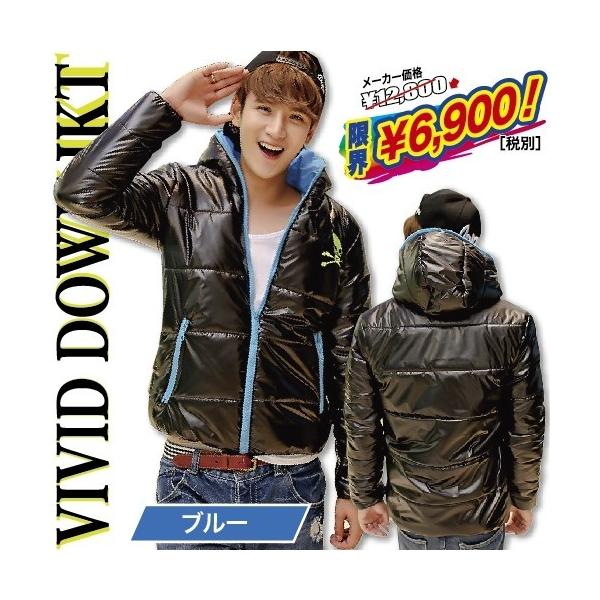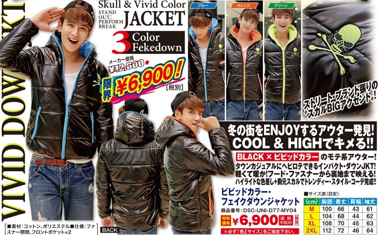 ビビッドカラー・フェイクダウンジャケット(メンズ/防寒/ライトダウン/フード付き/スカル/ファスナーカラー/ブラック) [DSC-UNID77MY04]