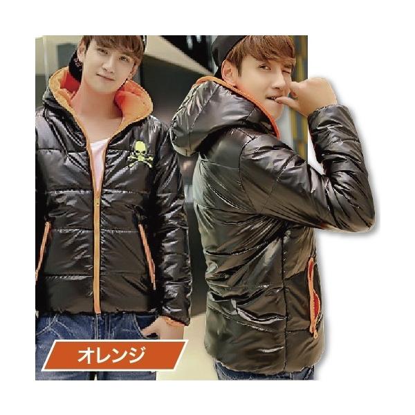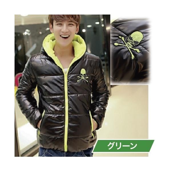ビビッドカラー・フェイクダウンジャケット(メンズ/防寒/ライトダウン/フード付き/スカル/ファスナーカラー/ブラック)