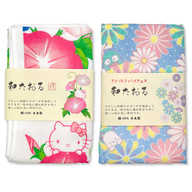 日本の和とサンリオが愛らしくマッチング。日本製ならではの肌触りの良いガーゼタオルです。