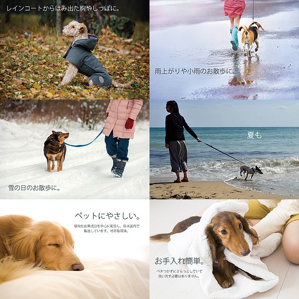 植物性原料を中心とした原材料が雨をはじくので、お散歩後はタオル等でふき取るだけでOK!