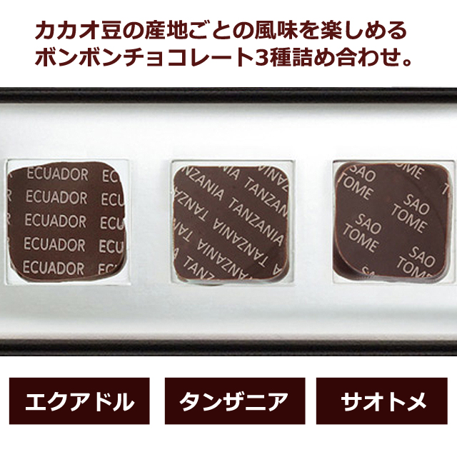 3種の原産地別ボンボンチョコレートが楽しめる詰め合わせです。
