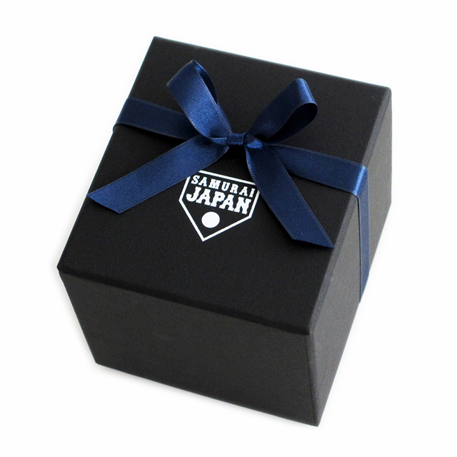 「侍ジャパン」ロゴの箔押しを施した最高級のオリジナルBOXに、紺のリボンをかけてお届けします。