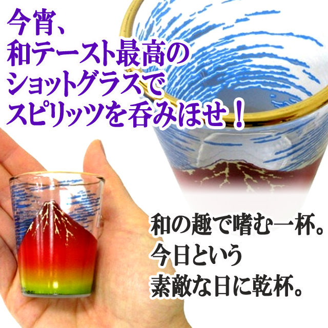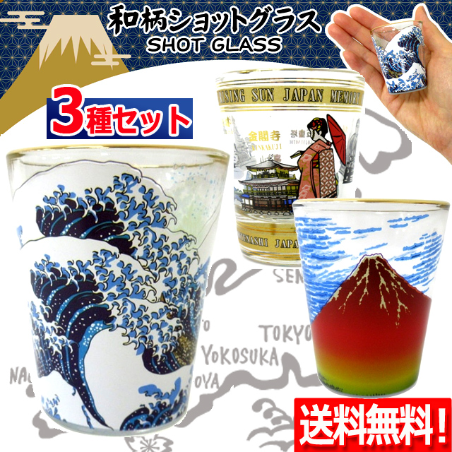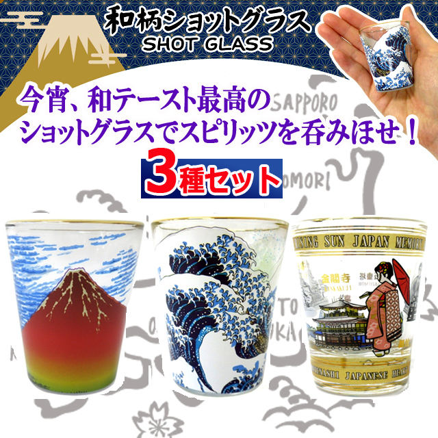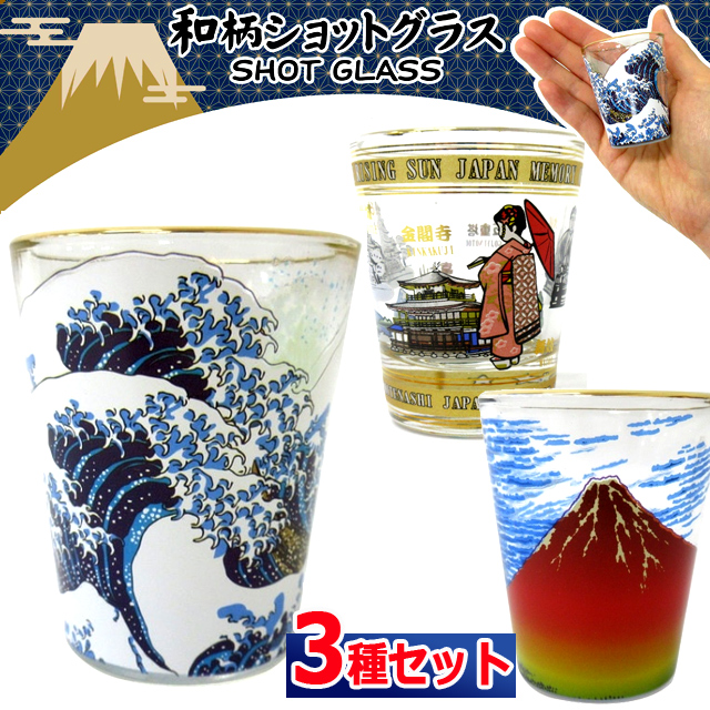 高品質ガラス製和柄ショットグラス3種セット 神奈川沖浪裏 赤富士 日本