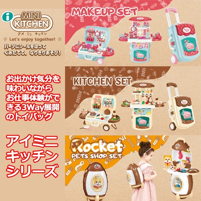 i MINI KITCHEN(アイミニキッチン)は、お出かけ気分を味わいながら職業体験ができる3WAYであそべるトイバッグシリーズです。