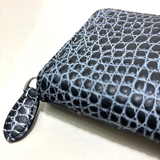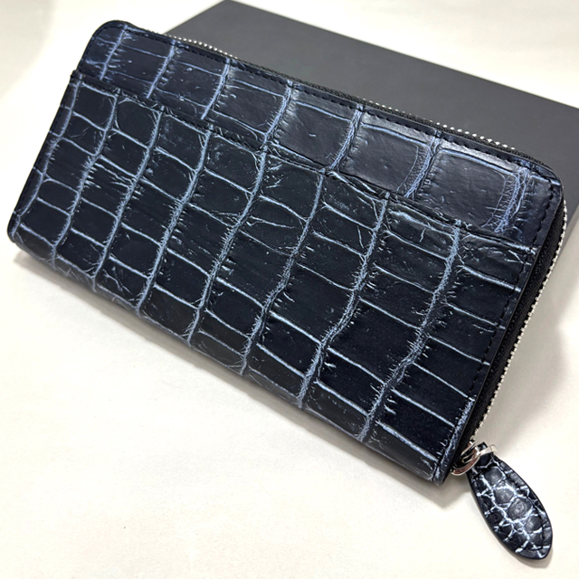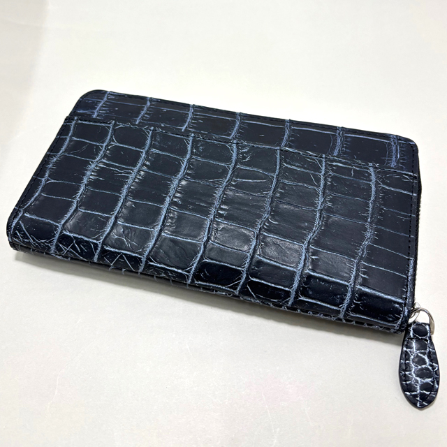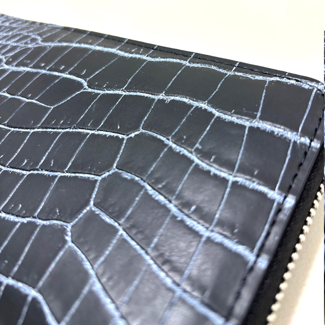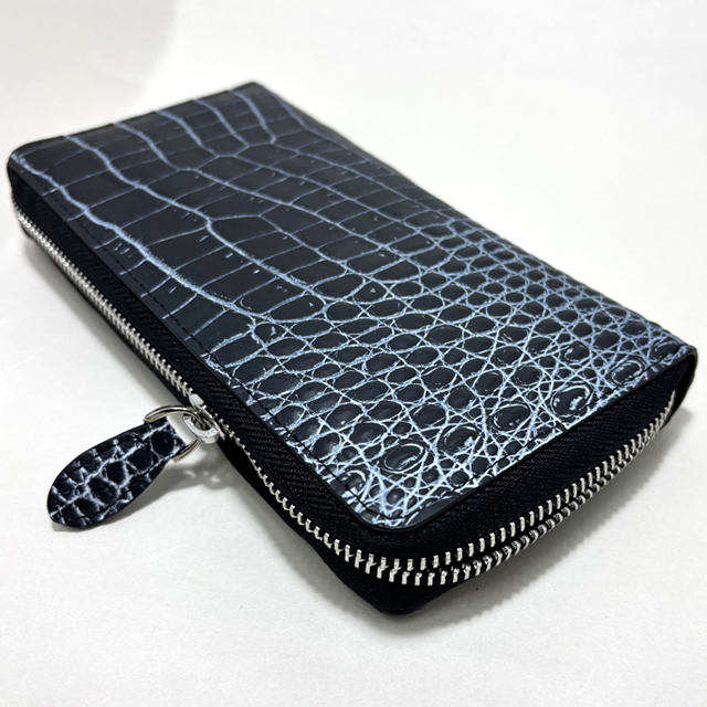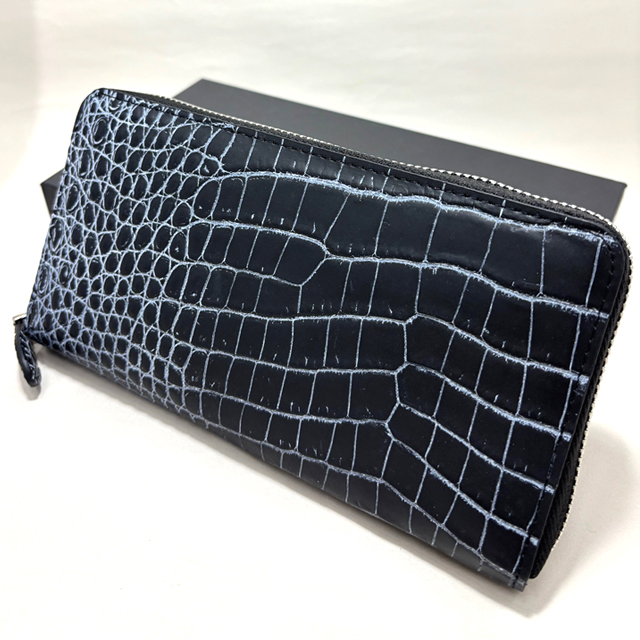 ハイクラスなクロコダイルレザーをラウンドファスナー使いのカジュアルな仕上げと致しました。