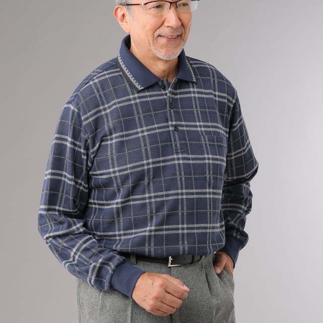 シックな色合いと格子柄を組み合わせた大人好みの長袖ポロシャツ2色組。