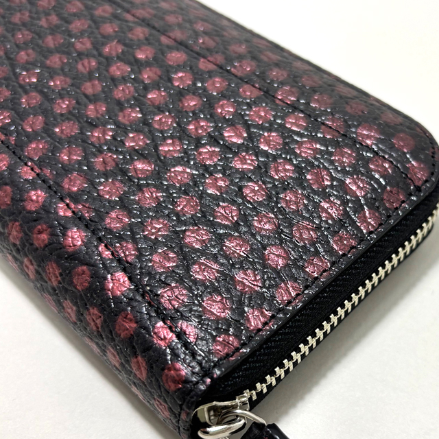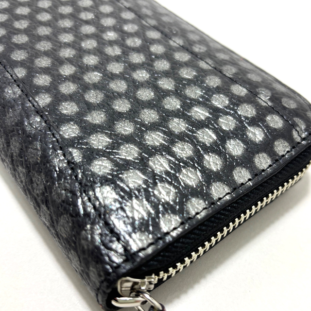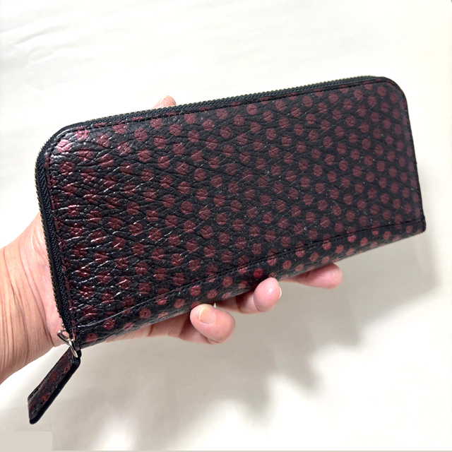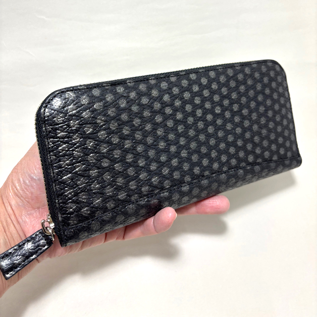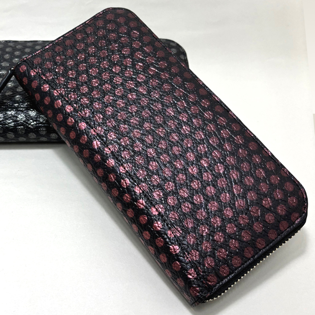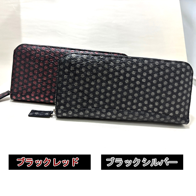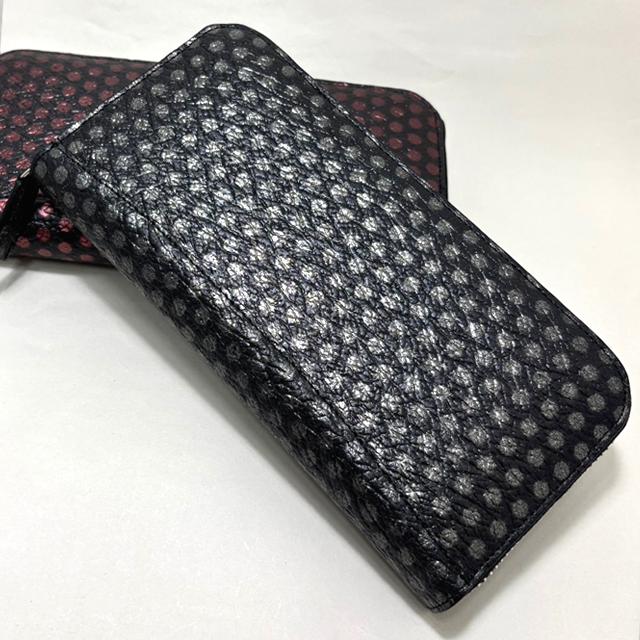 このたび、大変貴重な気仙沼産サメ革に、輝きのある水玉(ドット)模様をプリントした大変おしゃれな長財布です。