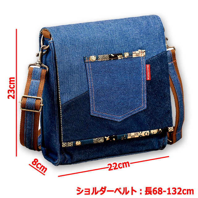 | 仕様 | ■サイズ:約幅22×高23×マチ8cm (ショルダーベルト:長68-132cm) ■重量:約440g ■材質:[外装]綿(デニム)[内装]綿 ■仕様:[前面]五角形オープンポケット×1 [前面フラップ下]ファスナーポケット×1 [内側]ファスナーポケット×1・ オープンポケット×2 ■付属品:ショルダーベルト、ハンドストラップ ■日本製 ※商品の特質上、一点一点柄の出方や風合い等が異なります。 |
