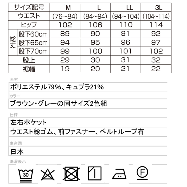 | 仕様 | ■セット内容:ブラウン・グレーの同サイズ2色組 ■素材:ポリエステル79%、キュプラ21% ■股下サイズ:股下60cm、股下65cm、股下70cm、 ■サイズ:M、L、LL、3L ■サイズ詳細(約cm) ※画像参照 ■仕様:左右ポケット、ウエスト総ゴム、前ファスナー、ベルトループ有 ■生産国:日本 |