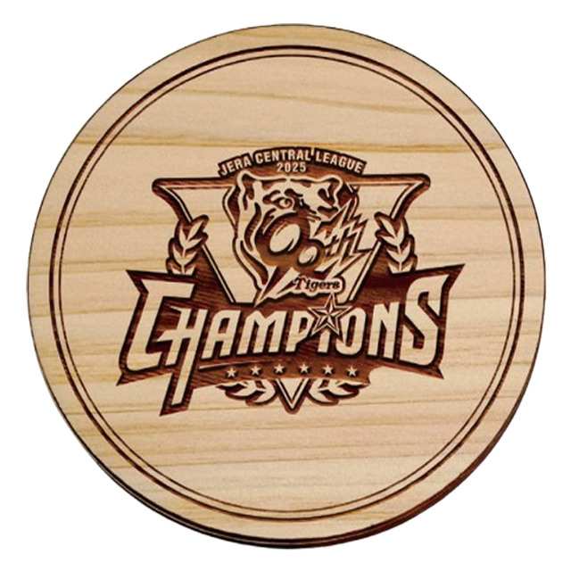 阪神タイガース 2025JERAセ・リーグ優勝記念ロゴをレーザー刻印したSDGsひのきコースター。