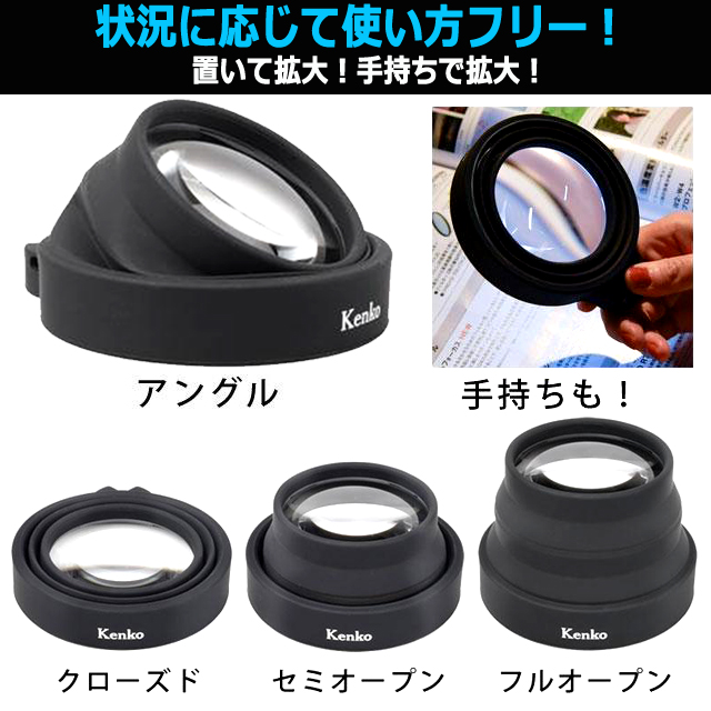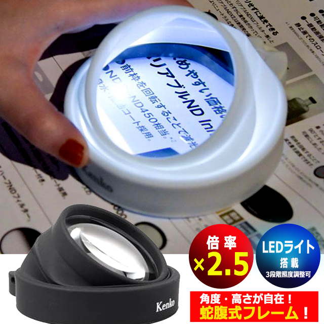 | 仕様 | ■サイズ:約縦12.3×横10.2×高2.2-7.4cm ■重量:約130g ■倍率:2.5倍 ■レンズ有効径:6.8cm ■LEDライト:14灯/3段階照度 ■電源:CR2016×2個orUSB電源 ■素材:シリコン・レンズ ■付属品:USBケーブル、レンズクロス ■色:【ブラック】【ホワイト】 |