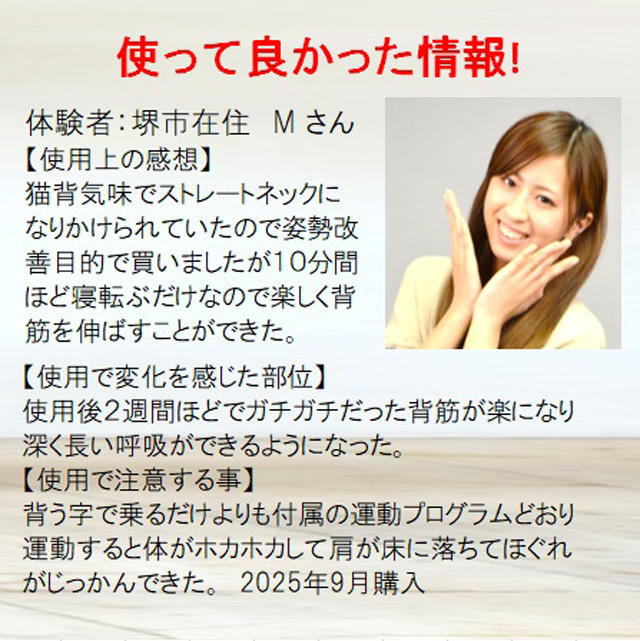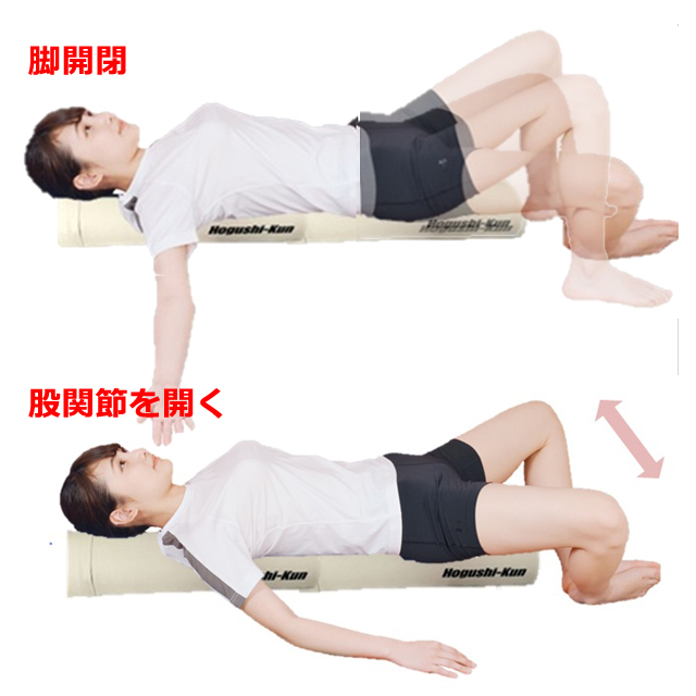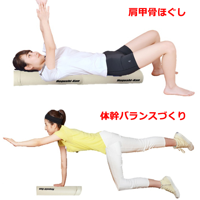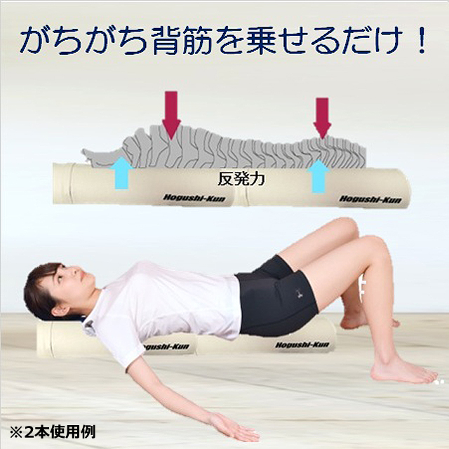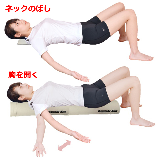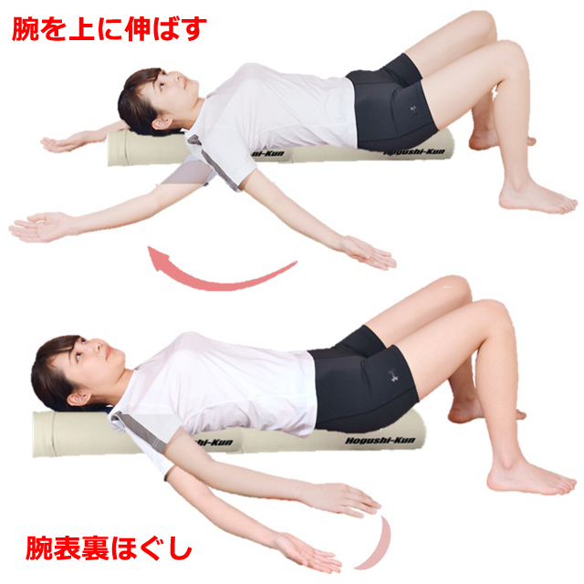 こちらのハーフポール「hogushi-kun ほぐしくん」の上に横になりリラックスする、重力で自然と肩が落ちます。