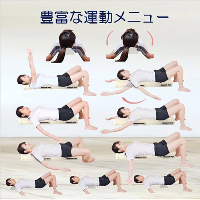 年齢問わず、安定したハーフポールにあおむけに横たわれば、コリがほぐれていく感じをすぐに体感でき、とっても気持ちの良いエクササイズとなります。