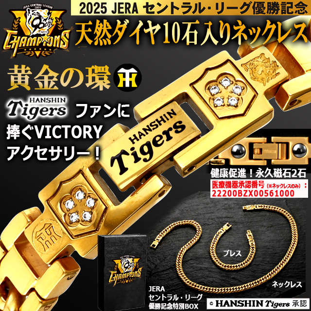 | 仕様 | ■幅:約1cm ■重量:[M]約34g [L]約40g ■材質:真鍮+ゴールドコーティング、天然ダイヤモンド×10石 ■医療機器承認番号:22200BZX00561000 ■付属品:オリジナルBOX (C)HANSHIN Tigers ■サイズ:【M】全長約45cm 【L】全長約55cm |