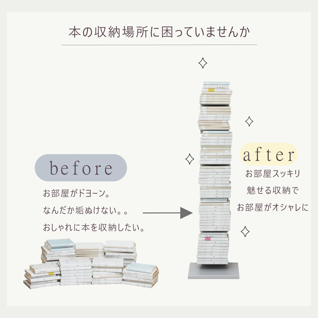 まだ読んでない本であふれていて収納場所に困っている方、このブックタワーシェルフで綺麗に積読(つんどく)してみませんか?