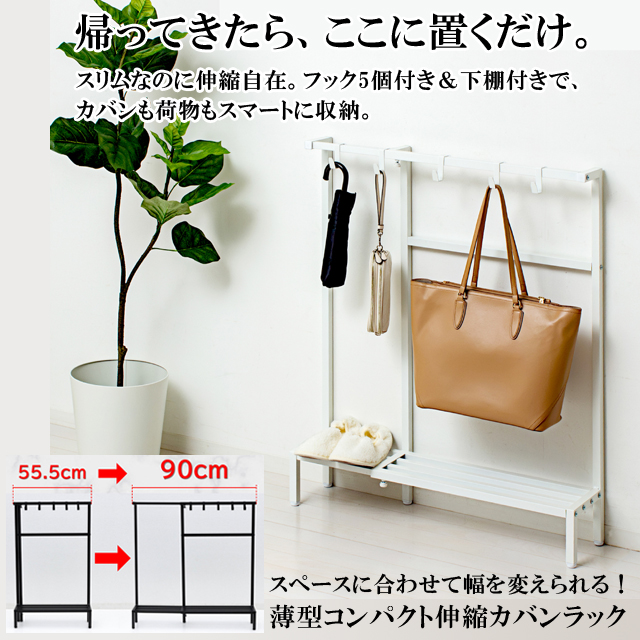 スペースに合わせて幅を変えられる!薄型コンパクト伸縮カバンラック 玄関収納ラック カバン掛けラック スリッパ置き 傘置き 狭小スペース対応ラック 新生活家具 新生活収納ラック 玄関周りの便利ラック エントランス収納 廊下収納 ワンルーム収納 スリム収納 薄型ラック 省スペース 伸縮ラック フック付き 下棚付き 一人暮らし収納 玄関すっきり