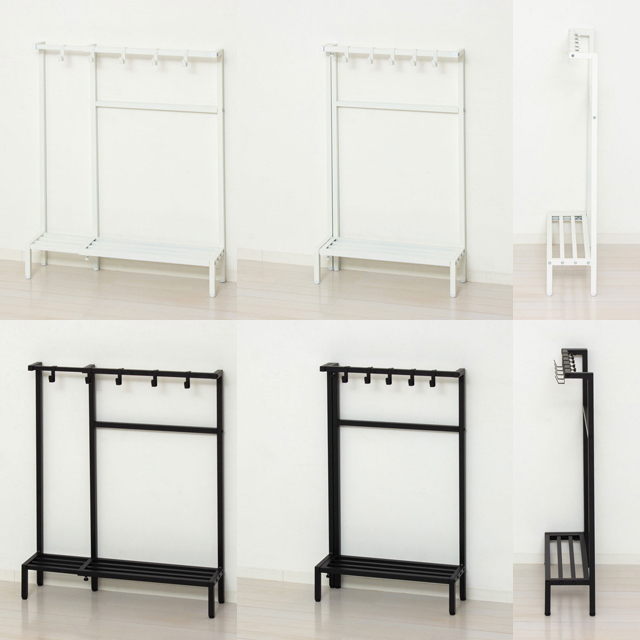 スリムなのに伸縮自在。フック5個付き&下棚付きで、カバンも荷物もスマートに収納。