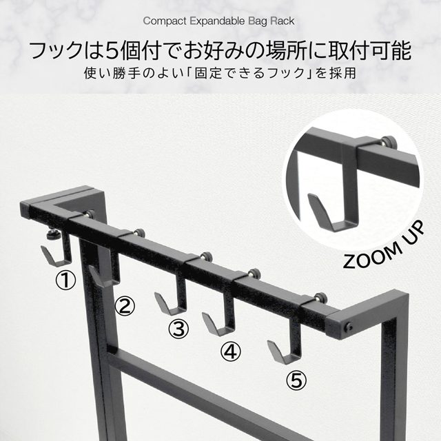 スチール製のパイプに付属のフック(5個付き)をお好みで配置していただければ」、リュックやトート、ポシェット、折畳傘などを便利に引っかけることが出来ます。