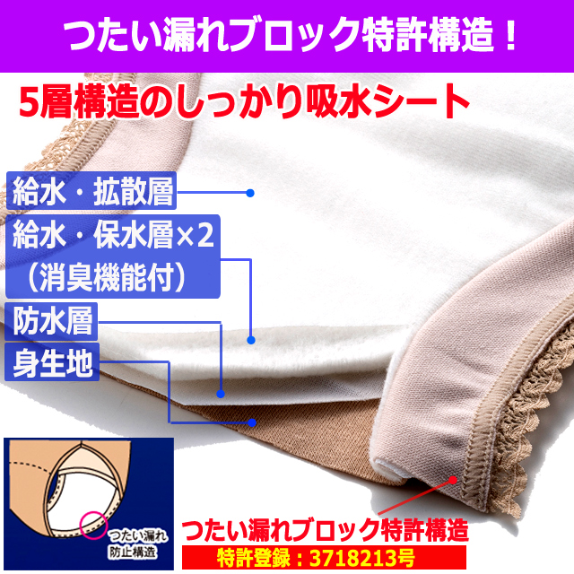 1点 しっかり吸水する特許取得品!5層構造安心ショーツ 1点 つたい漏れ 中失禁