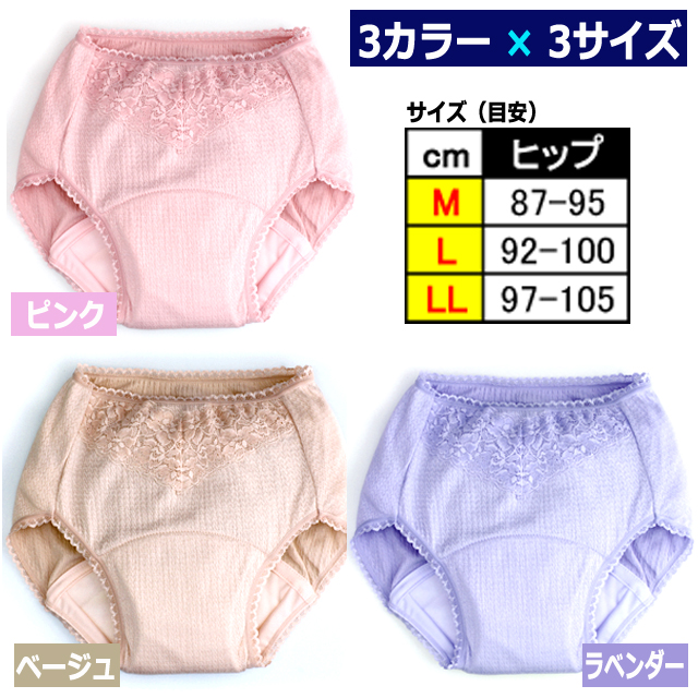 | 仕様 | ■材質:綿47%・アクリル29%・レーヨン21%・ナイロン2%・ポリウレタン1% ■吸水量(目安):約110cc ■仕様:洗濯可(ネット使用) ■特許登録:3718213号 ※つたい漏れブロック特許構造 ■日本製 ※就寝時や激しい動き、姿勢に応じて失禁する場合もございます。 ■色:【ピンク】【ベージュ】【ラベンダー】 ■サイズ:【M】ヒップ87-95cm 【L】ヒップ92-100cm 【LL】ヒップ97-105cm |