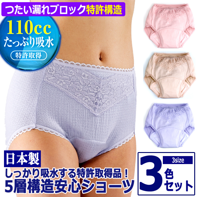 しっかり吸水する特許取得品!5層構造安心ショーツ 3色セット
