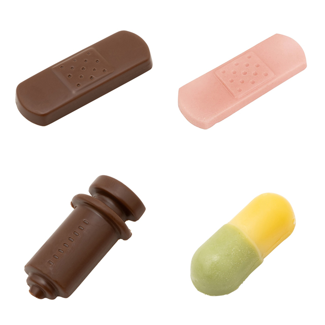 バンソウコウ型や注射器、カプセルなど、メディカルデザインがユニークなチョコレートセットです。