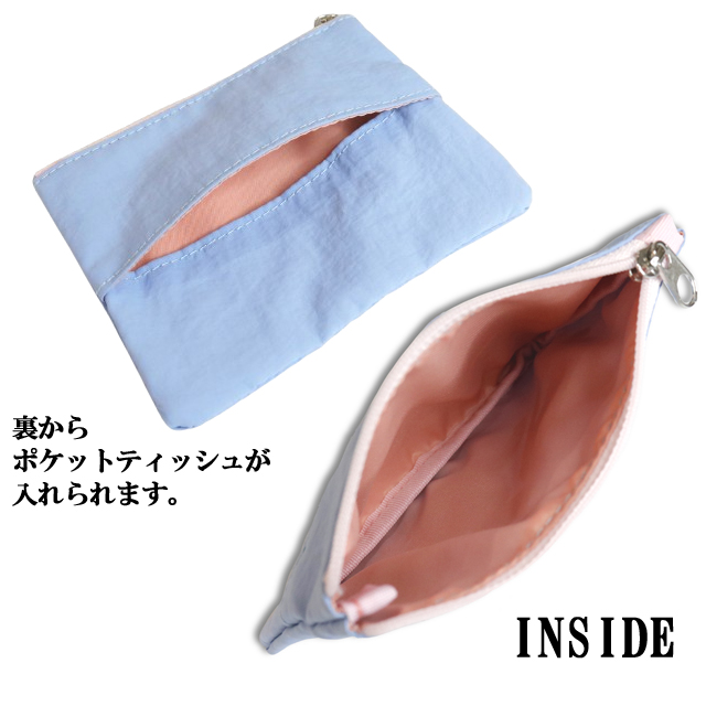 がさばらない薄型で、小さいサイズの裏にはポケットティッシュ入れが付いています。
