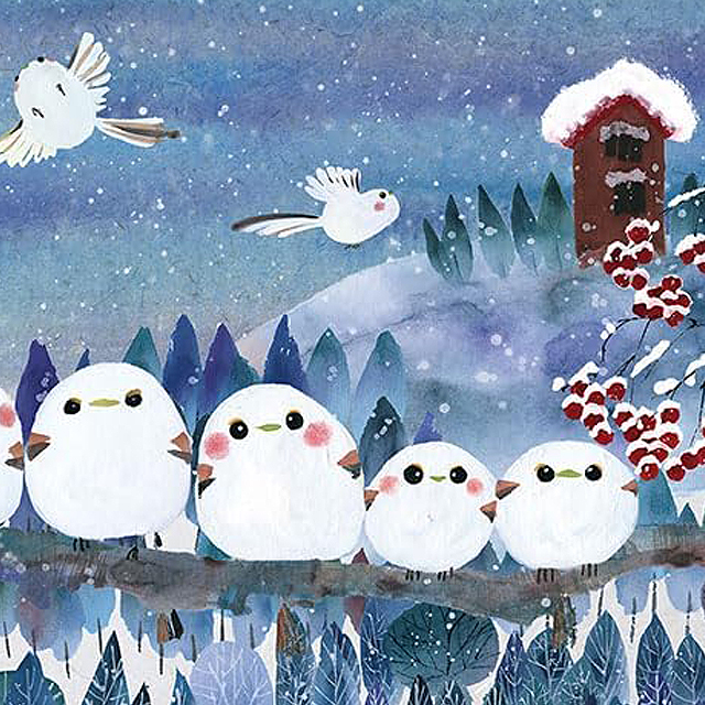 寒い寒い雪の中で、木の枝に片寄せあうように並ぶシマエナガを表情豊かに描いています。