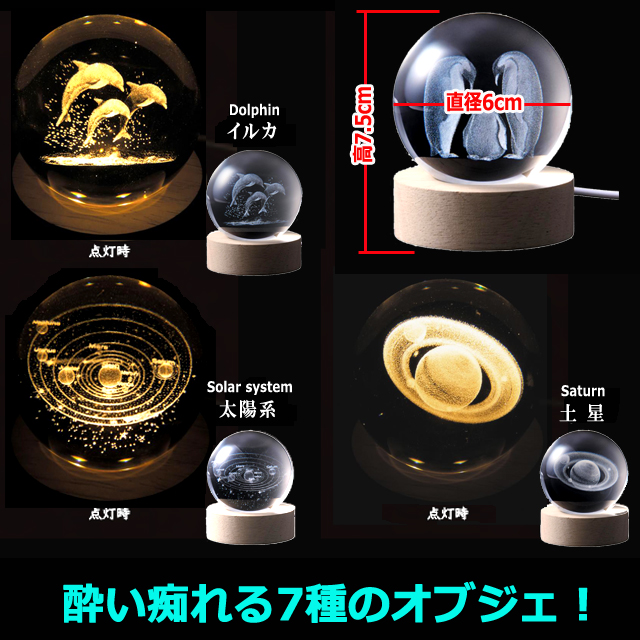 全7種!球内に繊細なる3D彫刻。光が発せられると異次元的アートが浮かぶ。