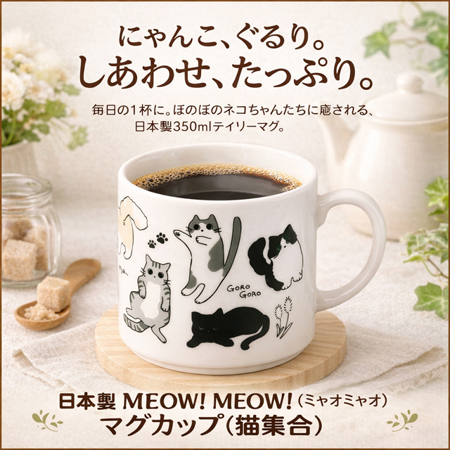 日本製 MEOW!MEOW!(ミャオミャオ)マグカップ(猫集合) ネコ 猫 ねこ 磁器製マグカップ 350ml 猫柄グッズ 猫コレクション ネコグッズ ねこアイテム 食器ギフト