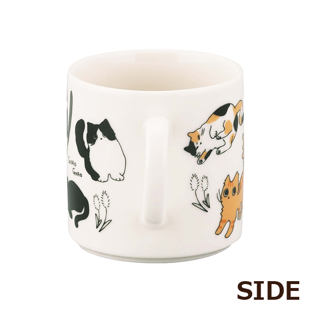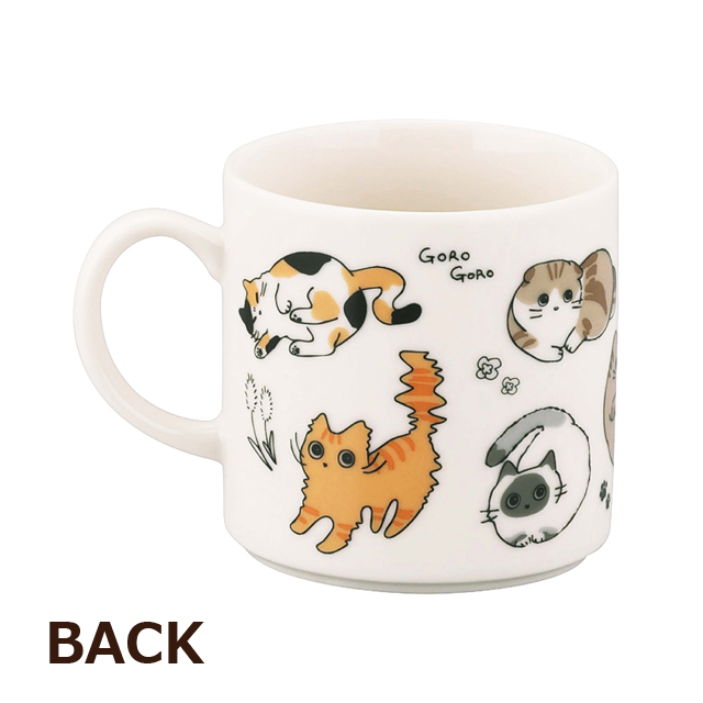 おどけたり、びっくりしたり、ゴロゴロしてたりと、日常の何気ない猫たちのしぐさを、ふんわりとしたタッチのイラストで描いたとってもかわいいマグカップです。