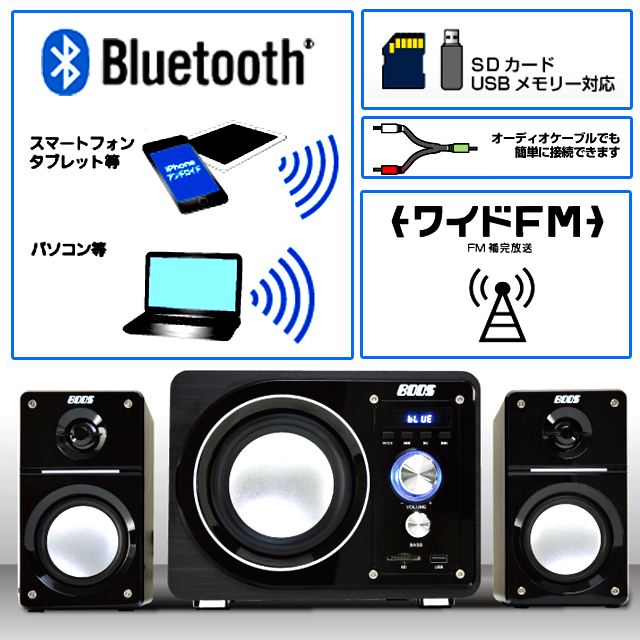 | 仕様 | ■サイズ: [サブウーファー]高180×幅240×奥240mm [サテライトスピーカー]高164×幅94×奥110mm ■重量:約4kg ■電源:AC100V 50/60Hz (コード長さ:約1.4m) ■最大出力:33W=[サブウーファー13W]+[サテライトスピーカー10W×2] ■消費電力:8-45W ■Bluetooth:Ver.2.1+EDR/2.4GHz/Class2/通信距離約10m ■Bluetooth対応プロファイル:A2DP、AVRCP、HFP ■入力端子:SDカードスロット、USB、外部 L/Rケーブル端子 ■FMラジオ:ワイドFM(76-108MHz)、オートチューニング機能 ■イコライザー:Normal/Rock/Pop/Classic/Jazz/Country (※イコライザー操作はリモコンのみ) ■付属品:リモコン、AUXケーブル、取扱説明書 ■メーカー:株式会社ホノベ電機 ■保証:1年 |