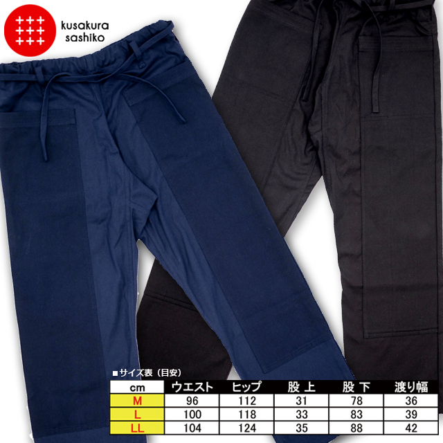 | 仕様 | ■素材:[本体]帆布 [ダブルニー]綿100% ■仕様:ポケット(フロント×左右・バック×左右)、ウエストゴム+紐絞り ■メーカー:株式会社 九櫻/日本製 ■色:【ネイビー】【ブラック】 ■サイズ(目安): 【M】ウエスト96cm ヒップ112cm 股上31cm 股下78cm 渡り幅36cm 【L】ウエスト100cm ヒップ118cm 股上33cm 股下83cm 渡り幅39cm 【LL】ウエスト104cm ヒップ124cm 股上35cm 股下88cm 渡り幅42cm |