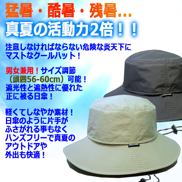 | 仕様 | ■サイズ:[頭囲]56-60cm(調整可)[つば]長8cm ■重量:約80g ■素材:ナイロン、ポリエステル 他 ■仕様:男女兼用・遮熱率55%以上・紫外線遮蔽率99.9%(UPF50+) ・ 撥水加工(表地)・消臭加工(汗取り)・着脱式あご紐付・手洗い可 ■色:【ベージュ】【チャコールグレー】 |