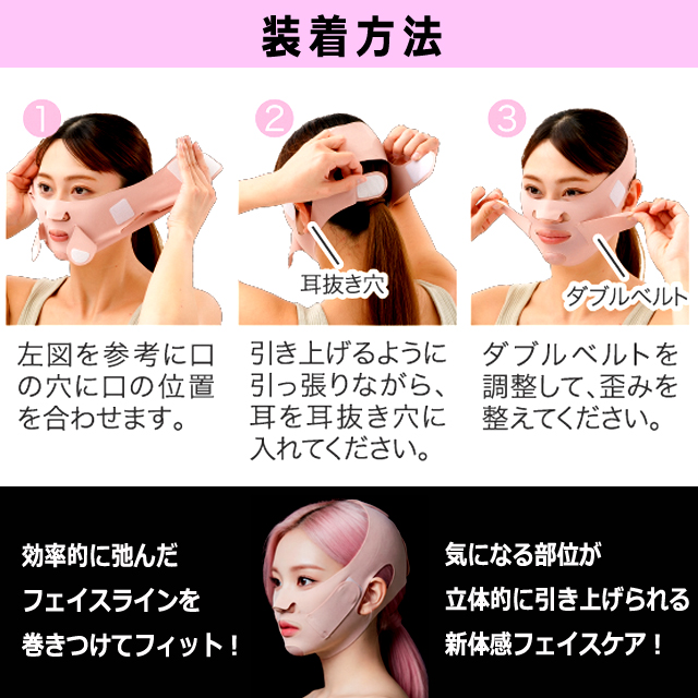 ほほ&あごの弛みをダブルベルトで立体的に引き上げ刺激!
