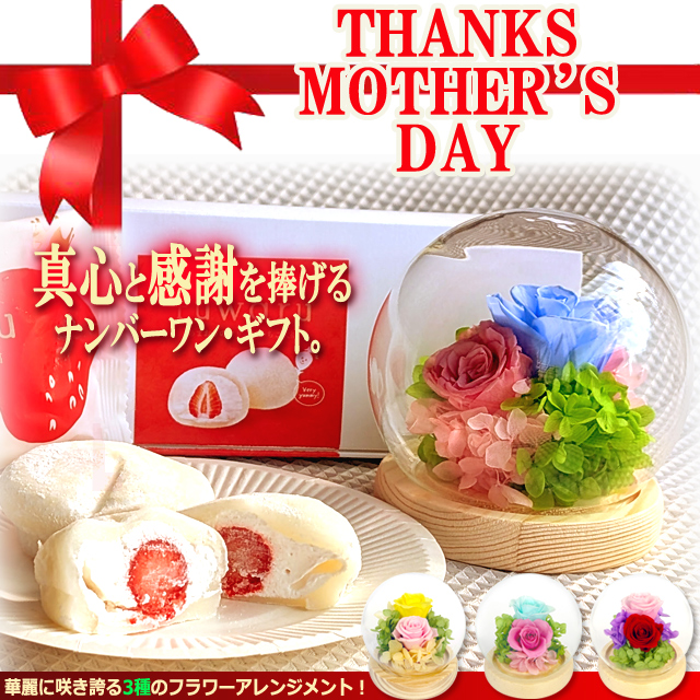 母の日企画 ホシフルーツ あまおうのクリームいちご大福fuwaru3個入&幸せのプリザーブドフラワーアレンジメント クリスタルドームセット